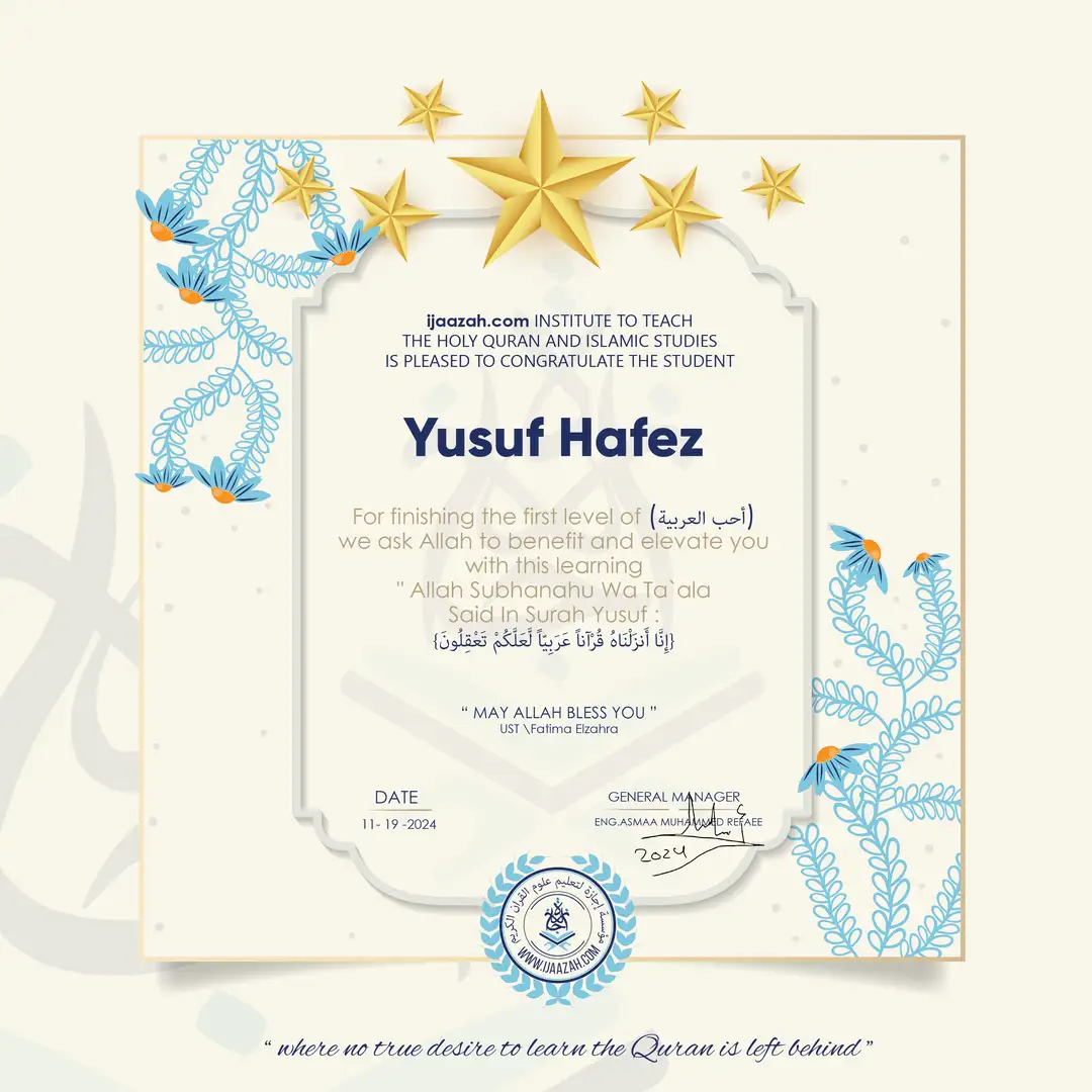 Yusuf Hafez for Finishing the First Level of (أحب العربية)