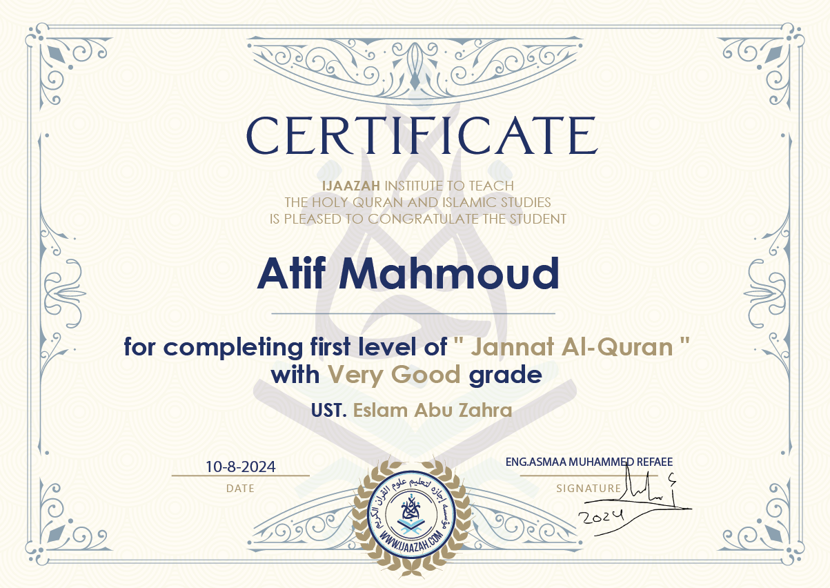 Atif Mahmoud for completing first level of \”Jannat Al-Quran\”