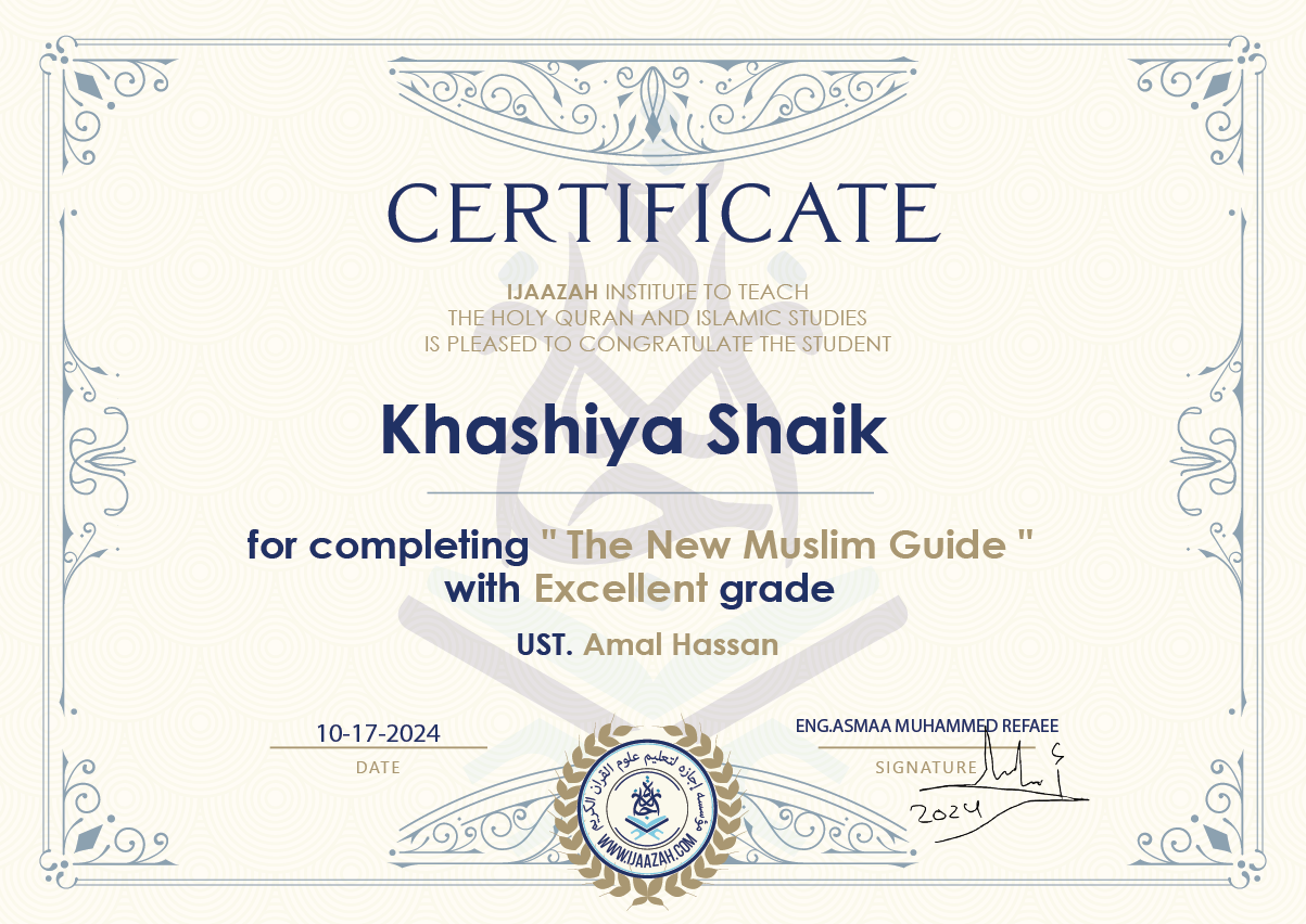 Khashiya Shaik for completing \”The New Muslim Guide\”