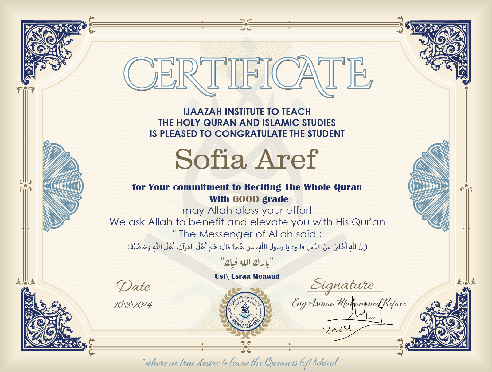 sofia Aref for Your commitment to Reciting the Whole Quran
