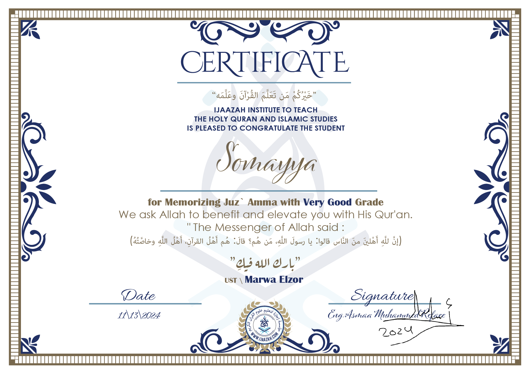 Somayya for Memorizing juz` Amma with Very Good Grade