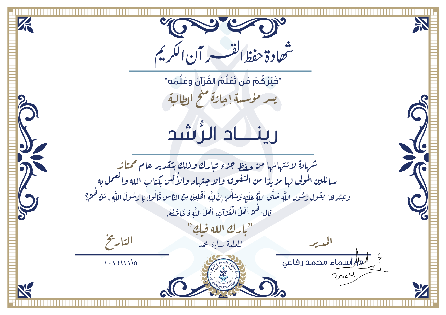 ريناد الرشد شهادة لانتهاء من حفظ جزء تبارك