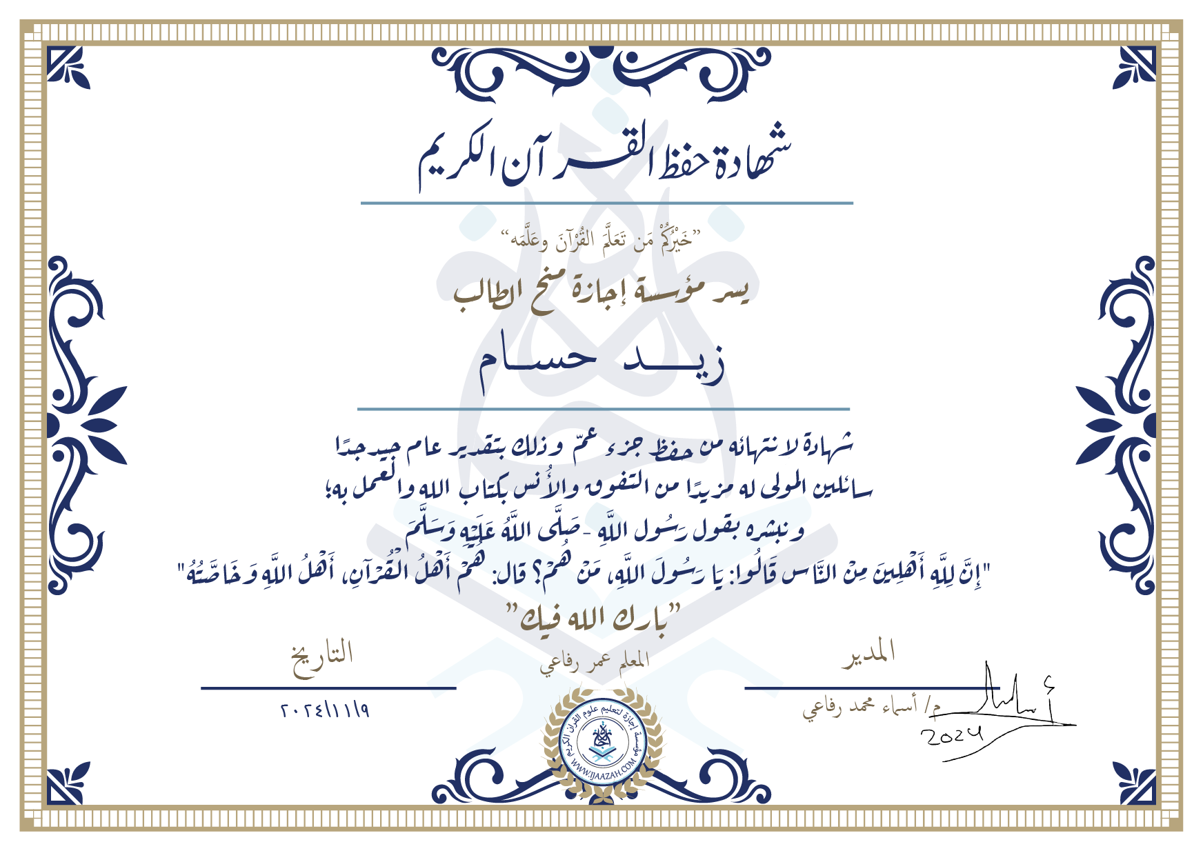 زيد حسام شهادة لإنتهائه من حفظ جزء عم